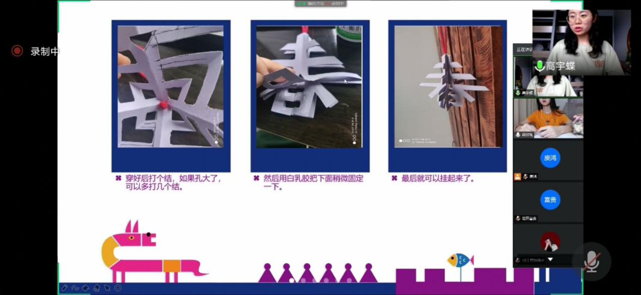 手工课上,志愿者向孩子们展示了立体“春”字的折法,小小的“春”像一棵小树,令人联想到中国最盛大的节日——春节。“可以在春节时将这个手工作品挂在家里,图个好兆头”,高宇蝶建议道。孩子们想到春节时能在家挂上自己的作品更加兴奋了,连折纸的速度都逐渐加快,一张张红色的折纸,在他们稚嫩的指尖飞跃,此时志愿者舒缓平静的声音指导着他们一步步向前,这和谐的画面在屏幕上显现,十分美好。