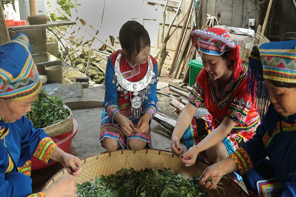 下午,志愿者们一同抵达乌饭宴制作地点。按照分工,一部分志愿者观摩并拍摄制作过程,另一部分志愿者与当地瑶族村民学习利用乌饭树的叶子制作乌饭,将乌饭树叶洗净、捣碎、和水,制成“乌水”,最后再用此水煮糯米,也就成了著名的“乌饭”。同时,热情的村民向志愿者讲述四八乌饭节的来历。通过村民的描述,志愿者了解到,四八乌饭节不仅传承了杨金花不惧恶势力的抗争精神,还弘扬了当地优秀的传统文化,是让来客了解当地人文精神的重要途径。